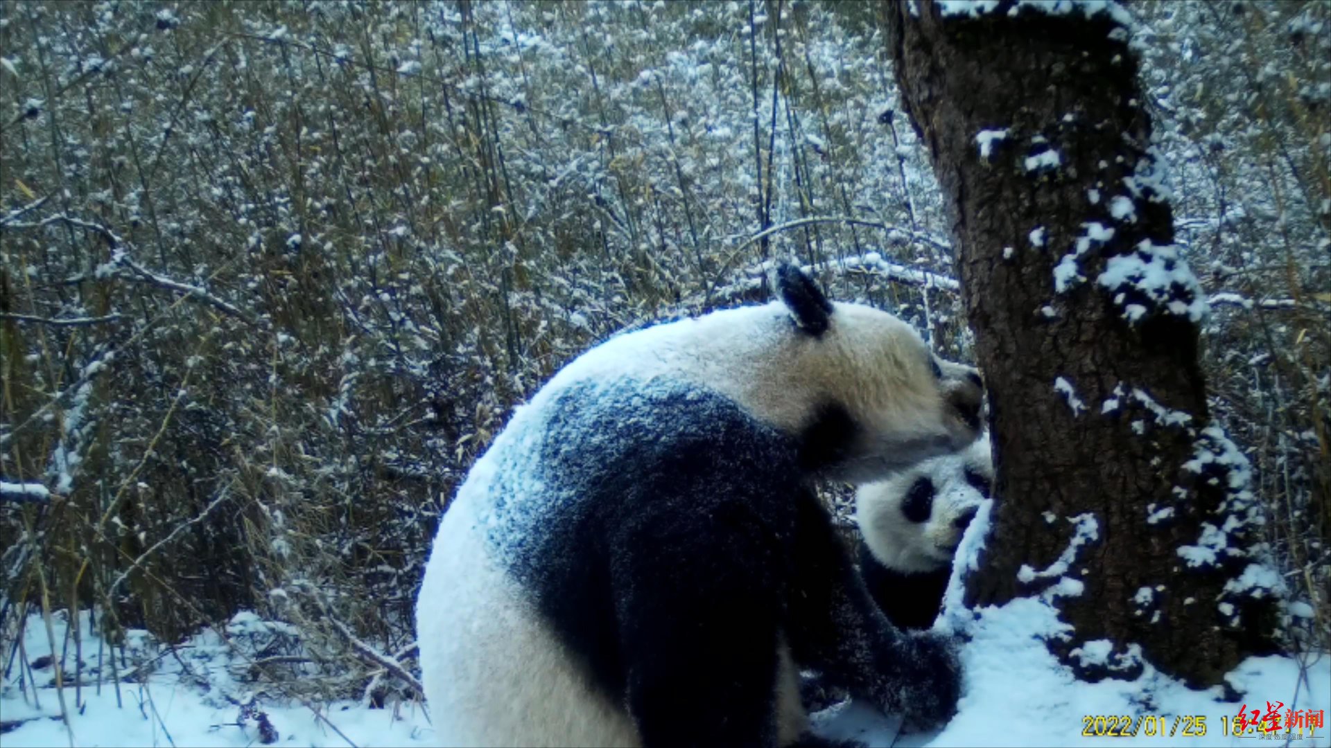 大熊猫国家公园王朗片区位于四川省绵阳市平武县境内,红星新闻记者从画面中看到,这段视频拍摄时间是今年1月25日,大熊猫妈妈带着大熊猫幼崽在冷杉树前通过模拟嗅闻、啃咬树干等方式向幼崽传授嗅味标记及识别方法,随后幼崽也在大熊猫妈妈同一位置做出类似相同动作。